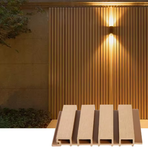 ألواح تكسية خارجية من مادة WPC (خليط الخشب والبلاستيك)، مصممة لتجميل واجهات المنازل والفلل والمباني، وتتميز بشكل خشبي طبيعي ومتانة عالية ضد الحرارة والمطر والشمس.