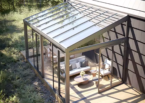 كابينة زجاجية جاهزة عالية الجودة، مصممة للمساحات الخارجية مثل الحدائق والروف. مصنوعة من ألمنيوم قوي وزجاج Low-E العازل للحرارة والضوضاء، مع تصميم حديث وسقف قابل للتخصيص. سهلة التركيب ومناسبة لجلسات خارجية أو غرفة زراعة