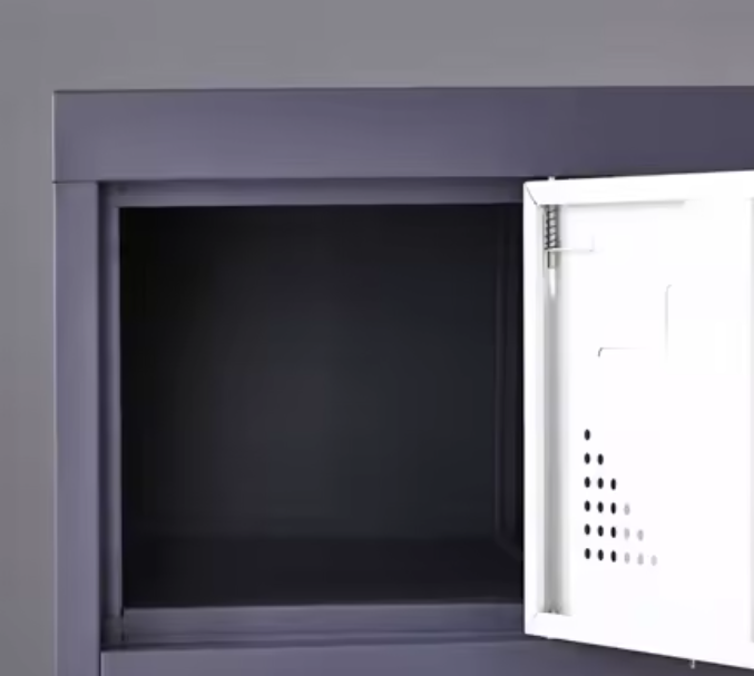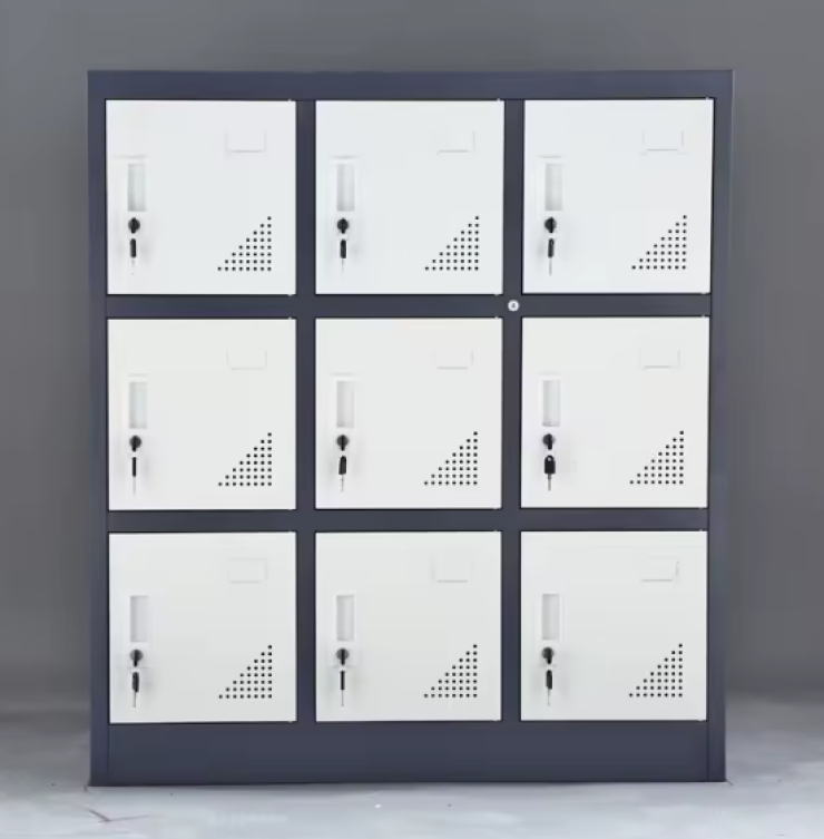 خزانة مكتبية من الفولاذ مع 9 أبواب منفصلة لكل باب قفل مستقل، مناسبة للمكاتب والمدارس والمستودعات. تشطيب بودرة متين وسُمك حديد 1.0–1.2 مم مع تصميم ثابت يُثبَّت على الأرض