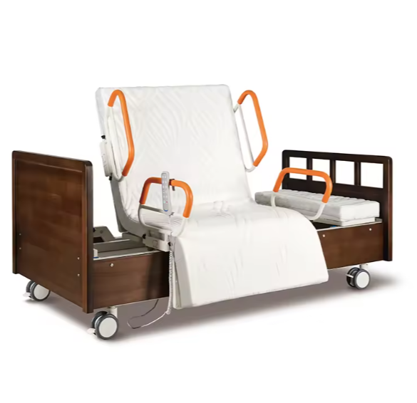 سرير تمريض كهربائي متحرك بزاوية دوران كاملة، مع رفع للظهر والرجلين ومقابض أمان جانبية. مناسب لكبار السن ومرضى الرعاية الطويلة، مصنوع من هيكل قوي مع تحكم كهربائي سلس