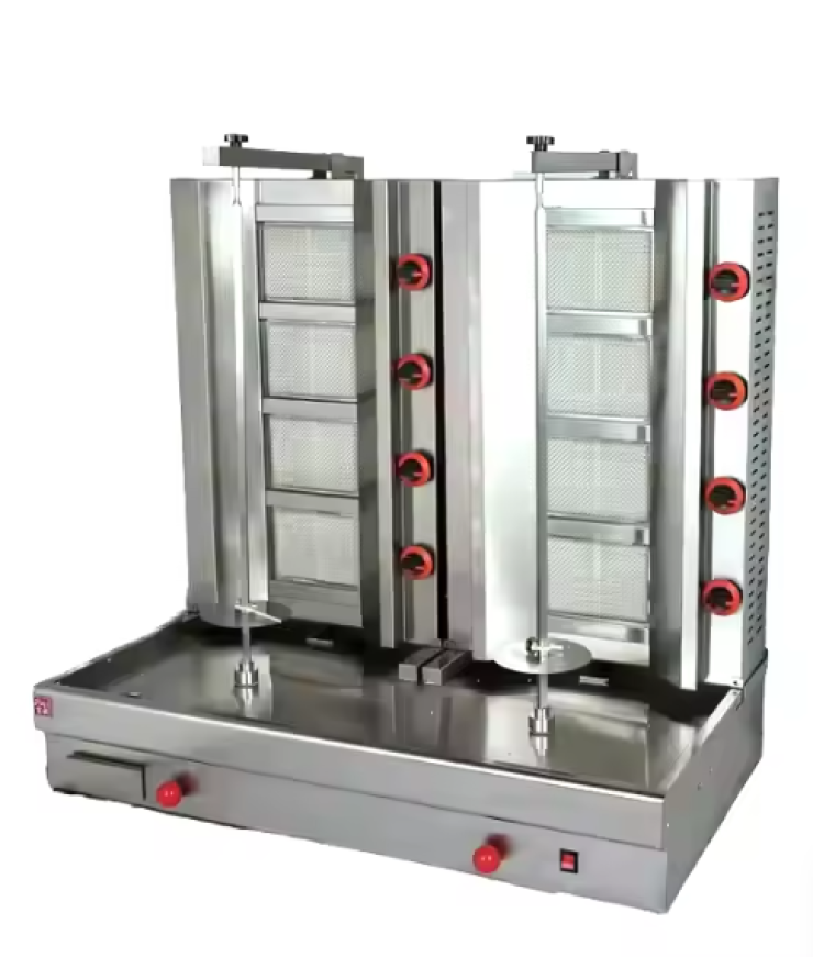 آلة شاورما احترافية مصنوعة من الستانلس ستيل، تعمل بالغاز وبجهد كهربائي 220V. مناسبة للمطاعم والكافيات والمشاريع الصغيرة. تأتي بتصميم ثابت وسهل الاستخدام، مع إمكانية تخصيص الحجم حسب الطلب