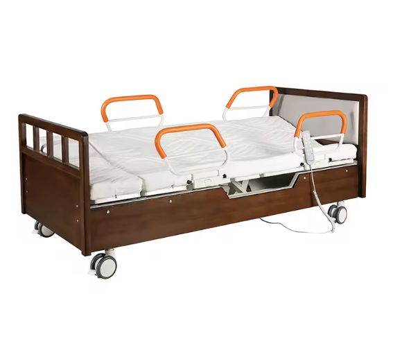 سرير تمريض كهربائي متحرك بزاوية دوران كاملة، مع رفع للظهر والرجلين ومقابض أمان جانبية. مناسب لكبار السن ومرضى الرعاية الطويلة، مصنوع من هيكل قوي مع تحكم كهربائي سلس